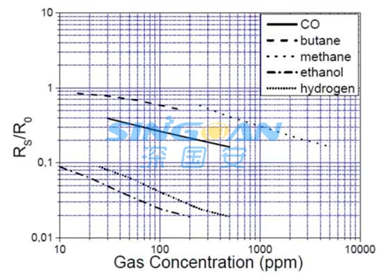 金属氧化物半导体传感器(MOS):MOS传感器的交叉干扰来自两个方面:PN结和催化剂。很早人们就发现硅片上的PN结的电阻对温度、湿度和环境空气是敏感的。后来人们为了放大该敏感度,就在PN结上涂上了对可燃气敏感的催化剂,并加热之,这样就构成了MOS传感器。MOS也不具有气体选择性,从市面上的传感器技术资料看来,凡是可燃气,MOS都是有响应的,如下图
